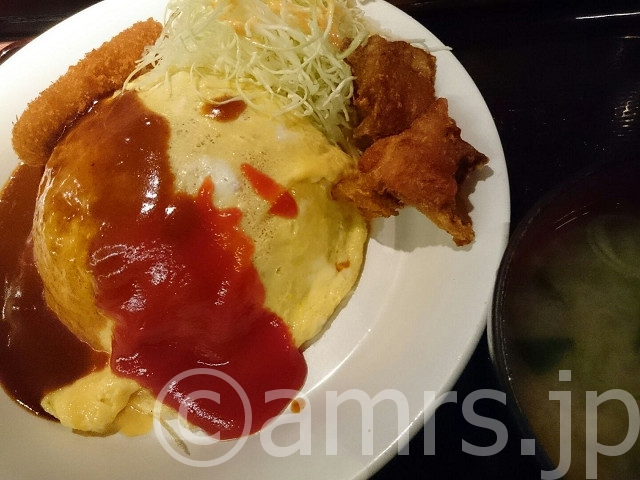 オムライスには、デミグラスソースとケチャップのダブルソースがけ