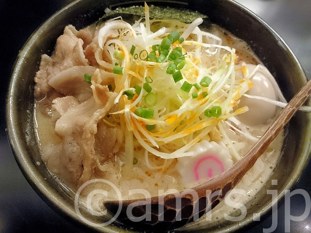 具は、白髪ネギ、豚バラ、味玉、海苔、なると、ワケギ、もやし