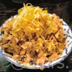 ご飯の上に山盛りの細切れチャーシューとタレと絡めたネギが乗る。