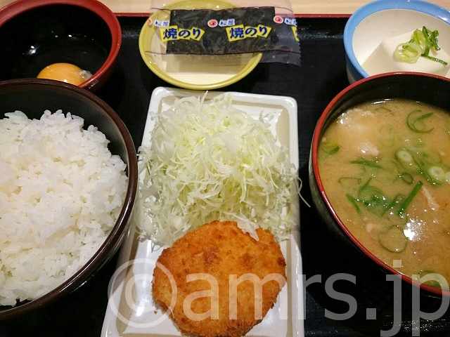 豚汁定食+コロッケ(朝定食)@松乃家 X Bluesky Facebook はてブ LINE2016.06.12食揚げ物卵・玉子FASTFOOD・ファストフード松屋系モーニング・朝食・朝ラーメン限定肉(チャーシューなど)満腹度10松乃家へ前回来た時に朝定食が、変わっていたのに気が付きまして こりゃ行かねば・・・と思っての訪問です。早速訪問しますと 豚汁定食は、コロッケ or 納豆 or 山形だし ヤ・マ・ガ・タ・ダ・シ? ちょっと冒険は危険と感じ、安パイを選んで豚汁定食+コロッケの食券を購入し入店待つ事1分 評価は、6点豚汁美味い。 そしてTKG・・・ コロッケは、作り置き。 さらに冷奴+海苔値段の割には、結構なボリュームです。繰り返すが、松屋系の豚汁は個人的に好きだ食べた物:豚汁定食+コロッケ 400円