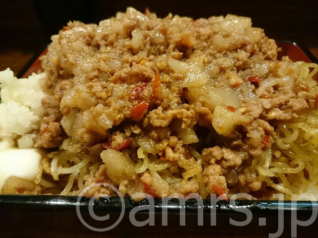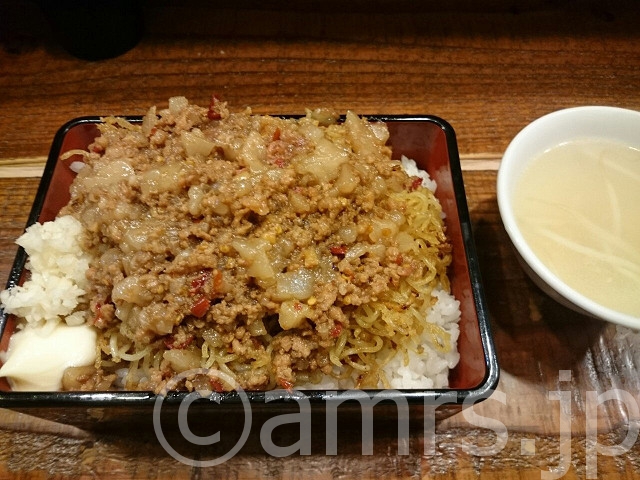 ご飯の上にカリカリ麺とマシライス、さらに豚がサンドされております(見えてませんが・・・)
