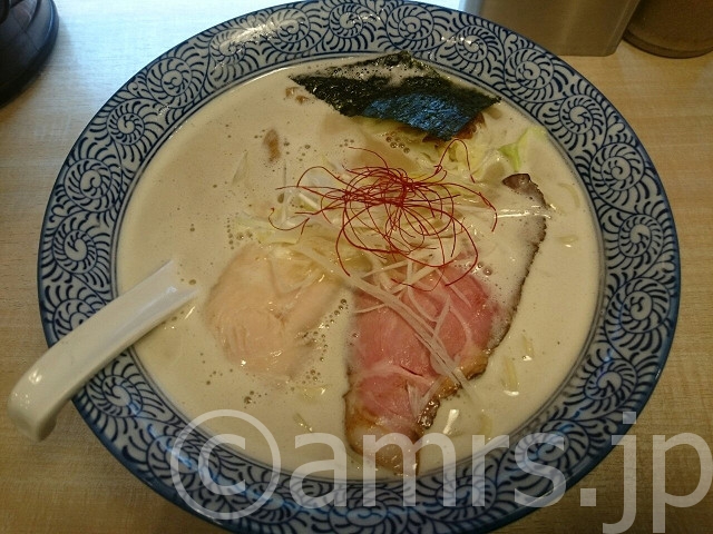 具は、鶏・豚チャーシュー、糸唐辛子、ネギ、キャベツ、海苔、魚粉