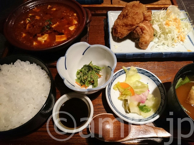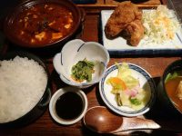 食べた物:黒麻婆豆腐とメンチカツ、鶏唐揚げ定食 850円