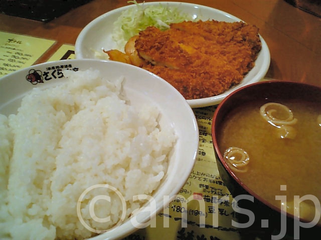 チキンカツ@海産物居酒屋 さくら水産 X Bluesky Facebook はてブ LINE2006.06.01食定食揚げ物限定食べ放題・ビュッフェ久々にさくら水産へ 500円あれば腹一杯と嬉しい限りの貧乏人の味方今日の日替わりは さんまとチキンカツ →チキンカツに決定!!って事で食券購入→入店→着席して 30秒 評価は、7点チキンカツの大きさは、ちょい小さめ それにキャベツの千切り、ポテト付まあ、500円でこれだけだったら満足行かないのですが ご飯、味噌汁、生玉子、味付け海苔のお代わり自由で、ここ来ると必ずやるのが生たまごかけご飯 これが美味いんだなぁ縲鰀また来よう!!