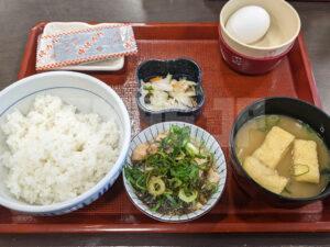 ご飯(並盛)、味海苔、京風つけもの、鶏小鉢、こだわり卵、味噌汁