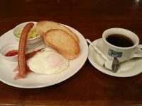 目玉焼き、ハッシュドポテト、ウインナー、ベーコン、パン、コールスローサラダ