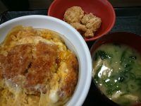食べた物:カツ丼(並) 490円(クーポン使用)、唐揚げみそ汁セット +180円
