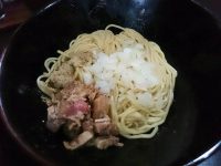 麺と刻みタマネギと刻みチャーシューと節とカエシ