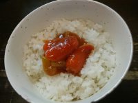 ご飯の上に、ケチャップベースのソースであえられたウインナーがON