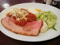 チーズ、ベーコン、温玉、ポテサラ、サラダのワンプレートミートソーススパゲッティ