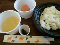 たまごかけごはん(スープ付)100g、フレンチトースト(バニラアイス&ホイップクリーム付)、ブリュレパンケーキ(カラメルソース付)