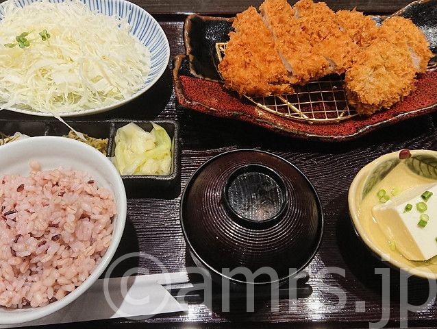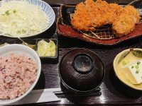 お新香、ご飯(麦)、キャベツ(千切り)、小鉢(豆腐)、ロース&ヒレかつ