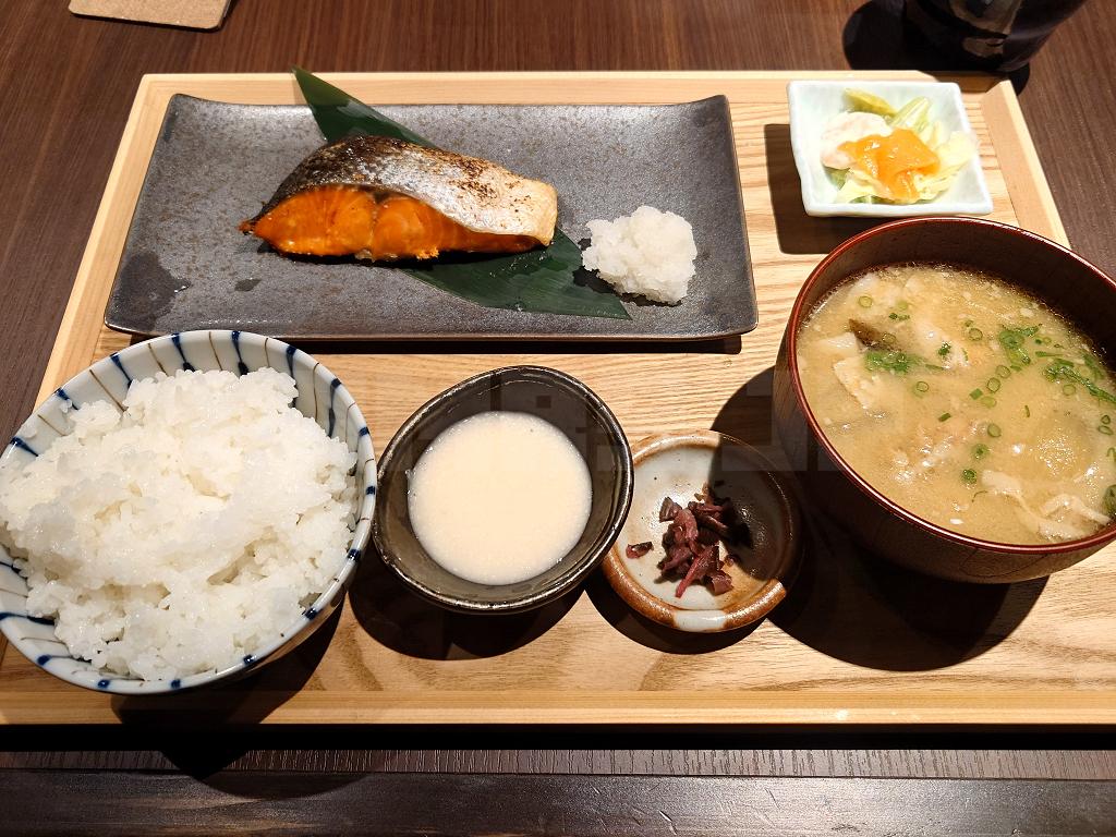 紅鮭の塩焼き、大根おろし、鮭サラダ、ごはん、とろろいも、お新香、たっぷり野菜豚汁