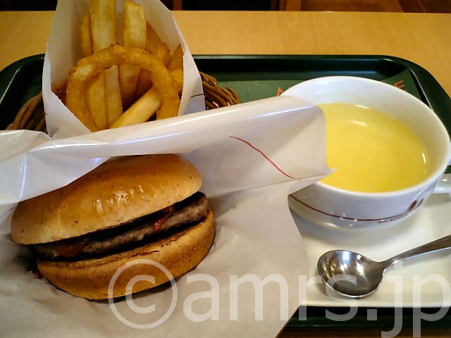 ハンバーガーセット(ハンバーガー、オニポテ、コーンスープのセット)を注文