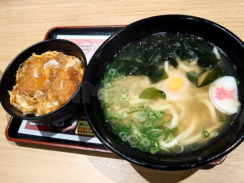 かしわおにぎり2個、月見うどん、ミニカツ丼を注文