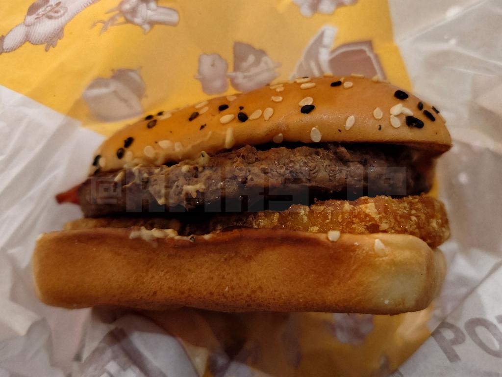 ビーフパティ、ポテトパティ、ベーコンが挟まれていつつ
