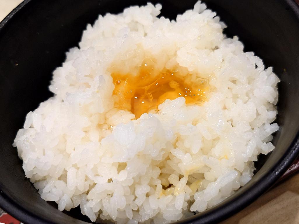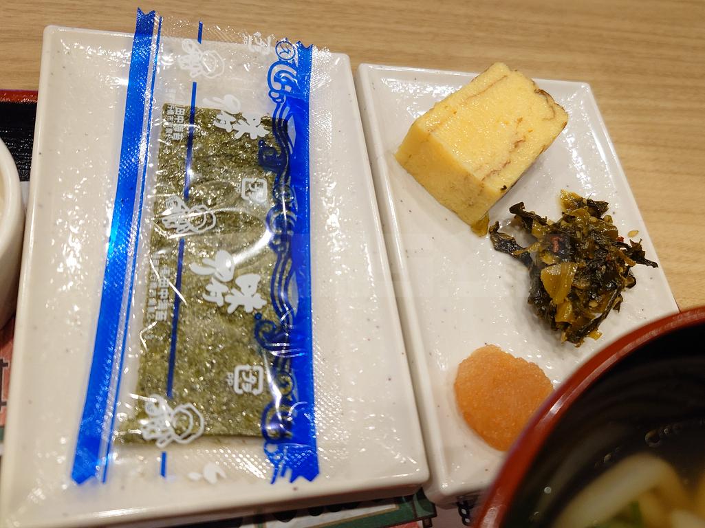 お新香、海苔、玉子焼き、辛子高菜、明太子、ご飯、かしわうどん、生たまご