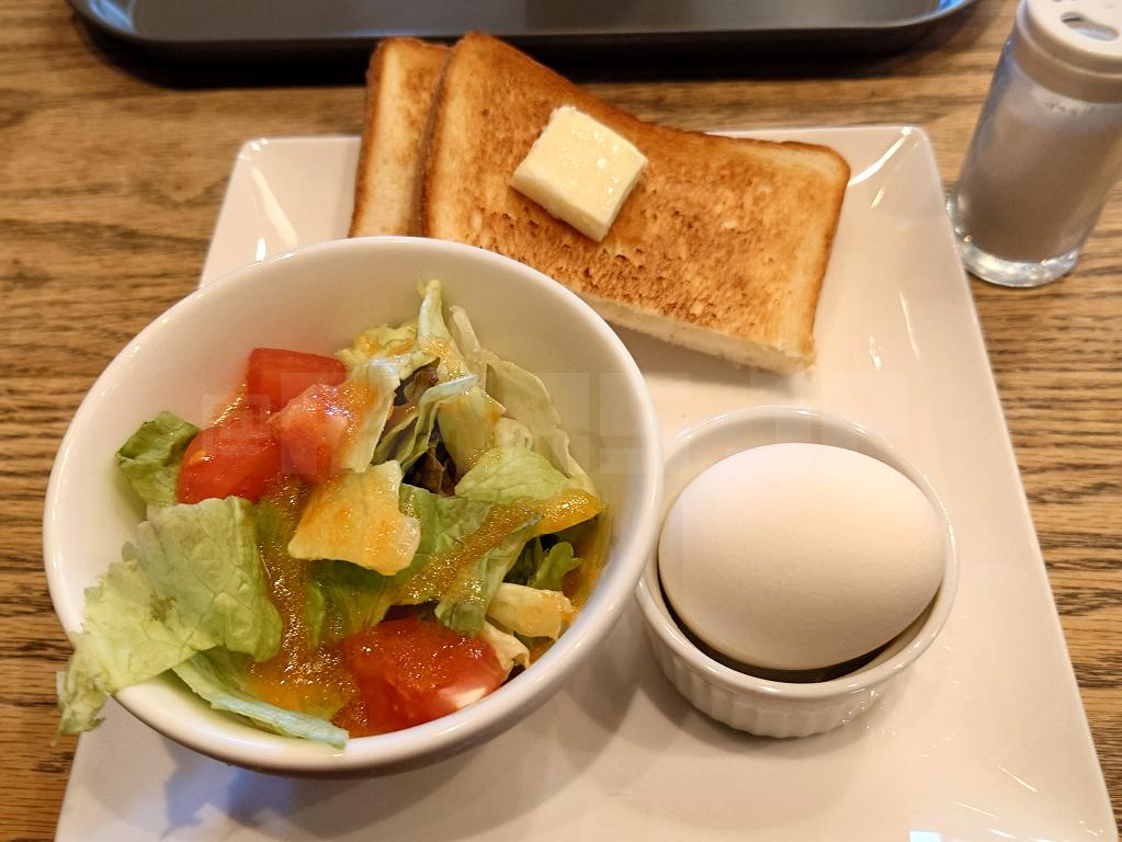 トースト、サラダ、ゆで卵、ドリンク