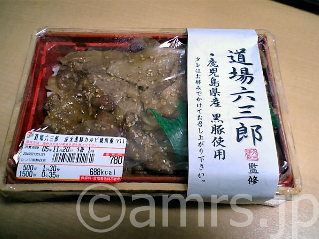 炭火黒豚カルビ定食重 byセブンイレブン X Bluesky Facebook はてブ LINE2005.11.20食テイクアウトキャンペーン中のセブンイレブンへ何気なしに寄ると 道場六三郎監修の弁当が売っていて 手に取り即買い!!そして温めてもらって帰宅し 撮ってみた(笑)温めたらちょっと箱がつぶれ気味・・・ まあ味に代わりはないので食ってみました。評価は、4点確かに味は美味い!!豚の下にゴボウが敷き詰められ 豚の味付けと言いゴボウの食感とが良く好印象しかし、マイナス点は、ボリューム感が無く値段が一番のネック!! 780円であれば確かにこの味出さなきゃまずいわなぁ縲鰀道場六三郎監修代、黒豚カルビ代が高いとかってな読みですけどね