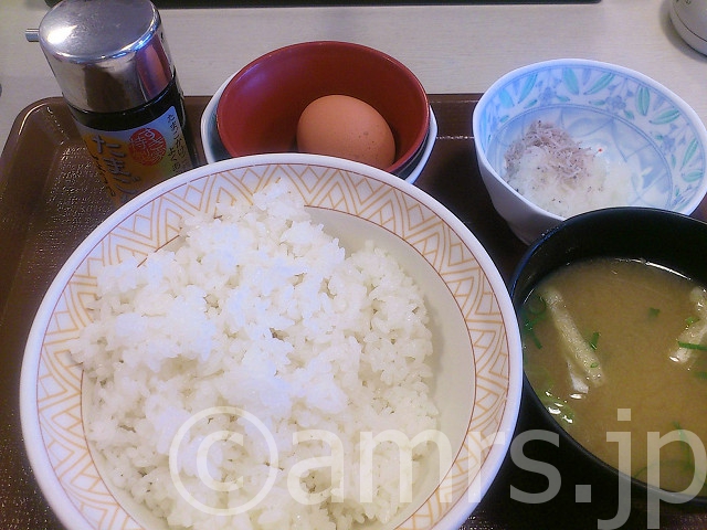たまごかけごはん朝食@すき家 X Bluesky Facebook はてブ LINE2012.07.26食FASTFOOD・ファストフードモーニング・朝食・朝ラーメンTKG(たまごかけご飯)朝から腹減りだったので、すき家へもちろん、お約束のたまごかけごはん朝食を注文。待つ事1分 評価は、7点前にも食べておりますが、味の変化、商品展開に変化無しまあ、TKGが食べたいって時には、コストパフォーマンス的にもイイね食べた物:たまごかけごはん朝食 200円