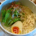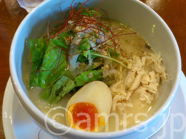具は、糸唐辛子、鶏肉、半熟卵(半分)、野菜、焦がしネギ