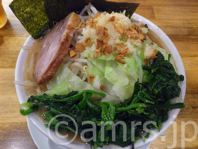 具は、ほうれん草、野菜、チャーシュー(肩ロース)、海苔、ニンニク、ニンニクチップ