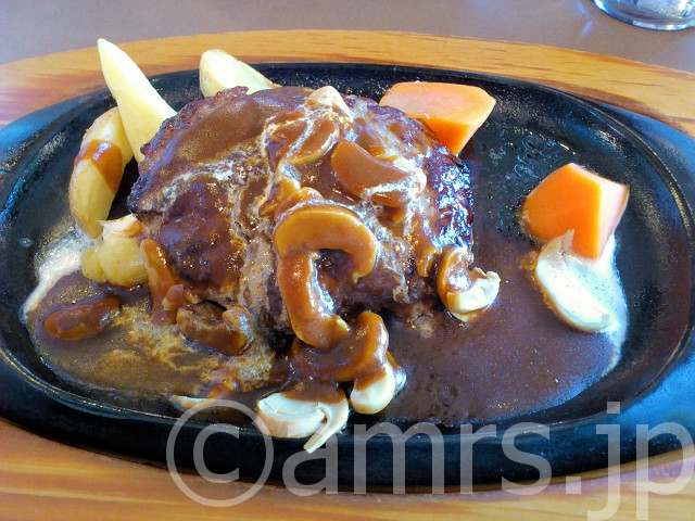 マッシュルームとデミグラスソースが乗るハンバーグ