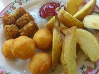 食べた物:豚カルビ炒飯 450円(キャンペーン価格)、ポテト盛り合わせ 390円