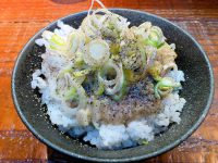 ご飯の上に背脂とネギにコショウが掛けられた物