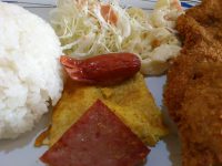 ご飯、スパム、ウィンナー、玉子焼き、マカロニサラダ、キャベツ、トンカツ