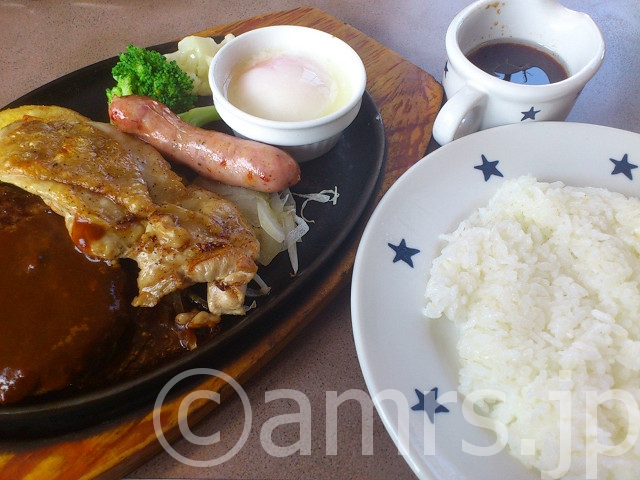 さて、土曜日ですから日替わりランチ→温玉デミハンバーグ&チキン&ソーセージ