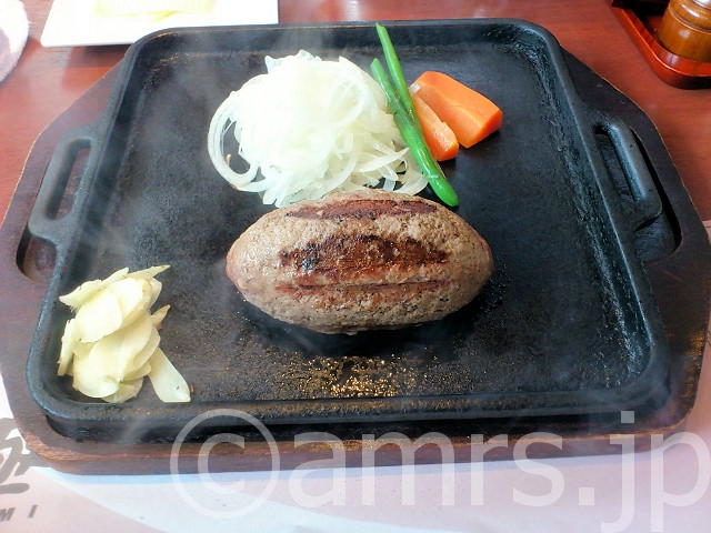 食べた物:黒毛和牛炭焼霜降りハンバーグ標準 1,575円、和風セット(ご飯、みそ汁、お漬物) 380円