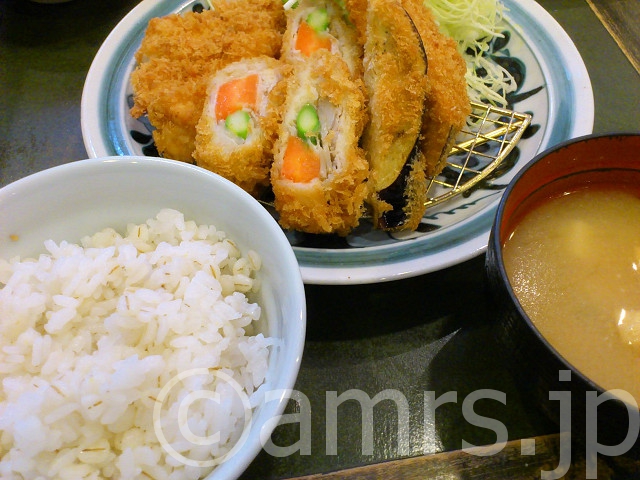 メニューを見まして春らしく、春野菜の巻きかつとチキンかつを注文。