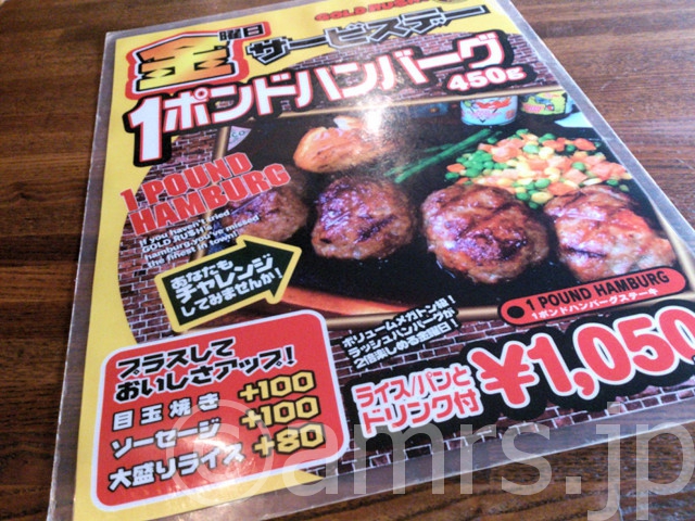 ゴールドラッシュの金曜日と言えば、ゴールドラッシュハンバーグ1ポンドセットが1,050円で食べられるというサービスデー