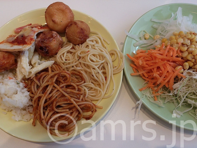 ペペロンチーノ、ミートソース、たこ焼き、グラタン、ベーコンピッツァピザ、チキンの甘辛ソース掛け