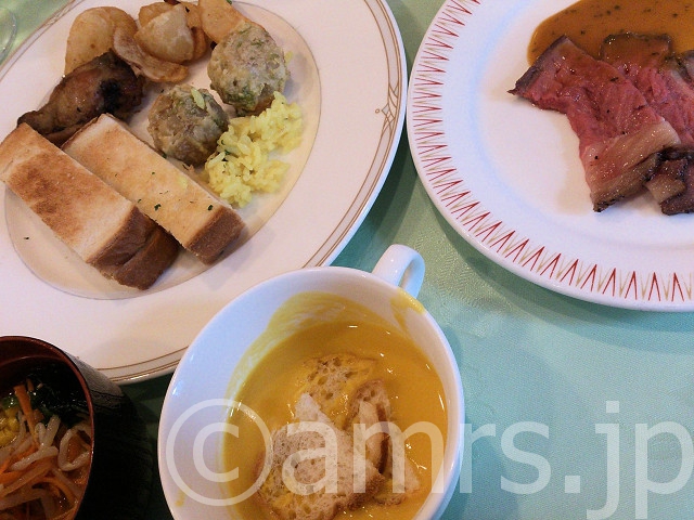 鶏ザンギ、フライドポテト、揚げシュウマイ磯部風味、ローストビーフ、クロックムッシュ、ピラフ、ポタージュ、味噌ラーメン
