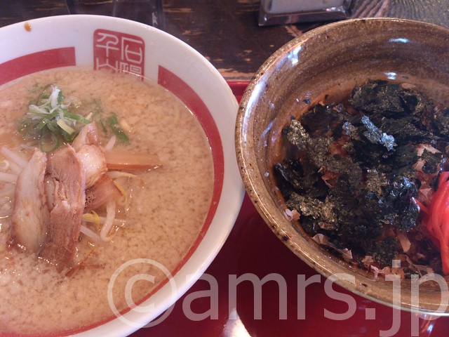 店頭に「平日ランチタイム限定 11:00-14:00 のり弁&半らーめん」と書かれたポップを拝見しまして