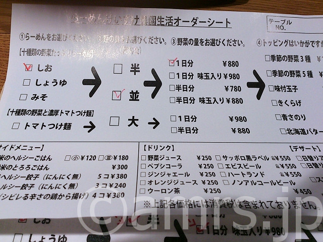 食べた物:十種類の野菜たっぷりラーメン 塩(1日分の野菜) 924円