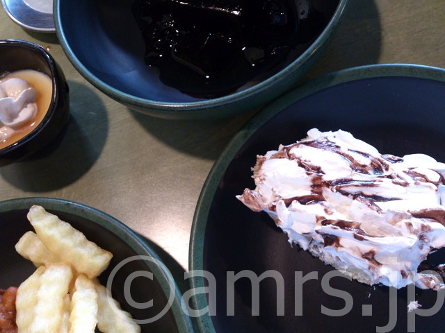 ケーキ(?)、唐揚げ、ポテトフライ、プリン、ゼリー