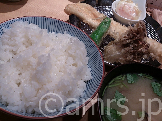 ごはん、あさりの味噌汁、しし唐、舞茸、穴子天、玉子の天ぷら