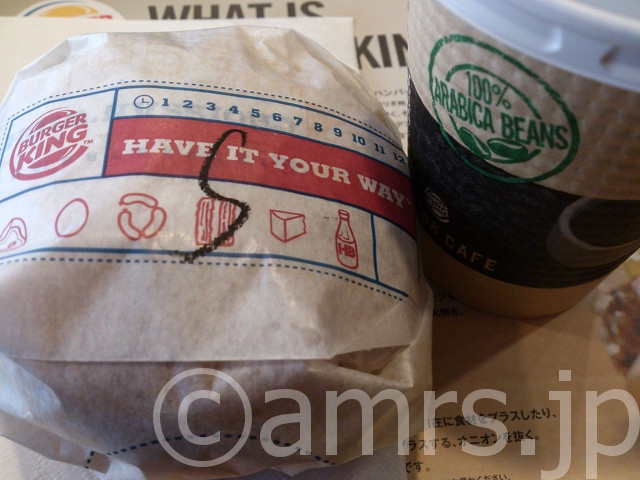 スパム&チーズコンビ@バーガーキング X Bluesky Facebook はてブ LINE2014.05.14食ハンバーガーFASTFOOD・ファストフードモーニング・朝食・朝ラーメン肉(チャーシューなど)新しくなったモーニング、バーガーキングへ店頭にあるメニューを拝見しましたが 確かに新しくなっておりますねしかし、若干値も上がったような気が・・・ まあ、いいやと早速入店→スパム&チーズコンビ注文。待つ事3分 評価は、5点包を開けますと こんな感じ現物は全体的に薄い。 前に食べたチーズクロワッサンも同じくでしたが・・・味は、スパムの塩気がちょっと強いかなと・・・ そんな感じ食べた物:スパム&チーズコンビ 350円