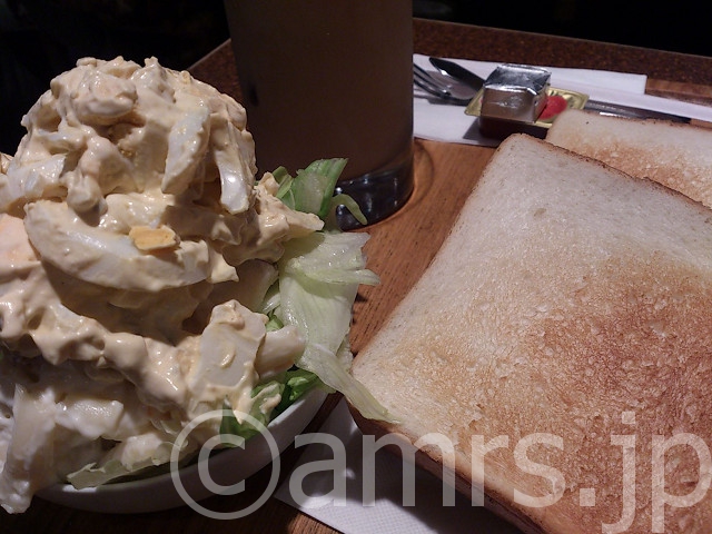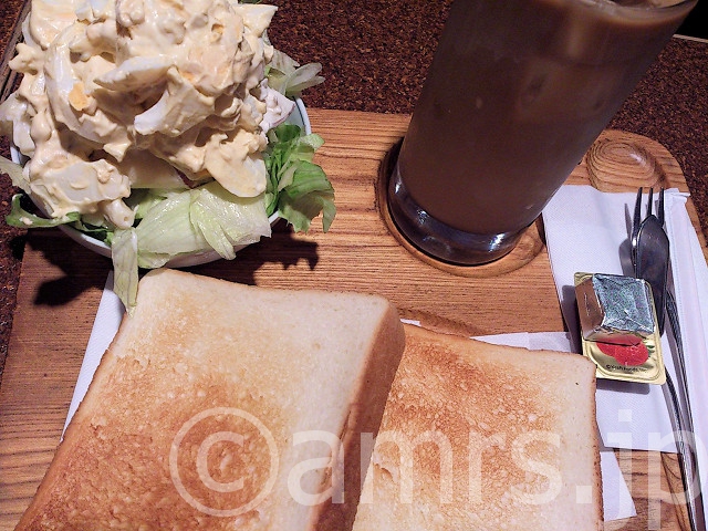 厚切りのパンが2枚、盛りに盛られたサラダ&アイスカフェ・オ・レ